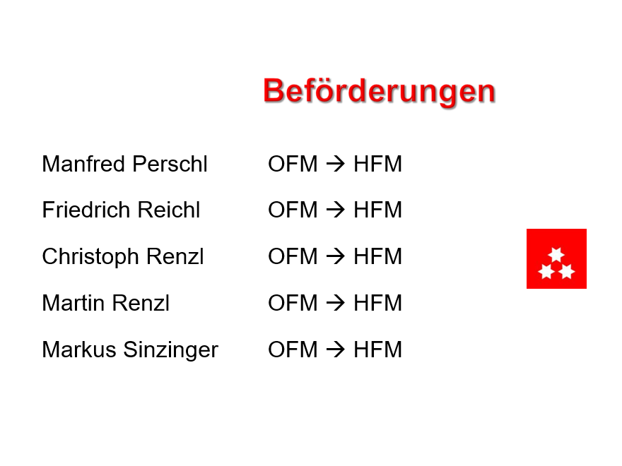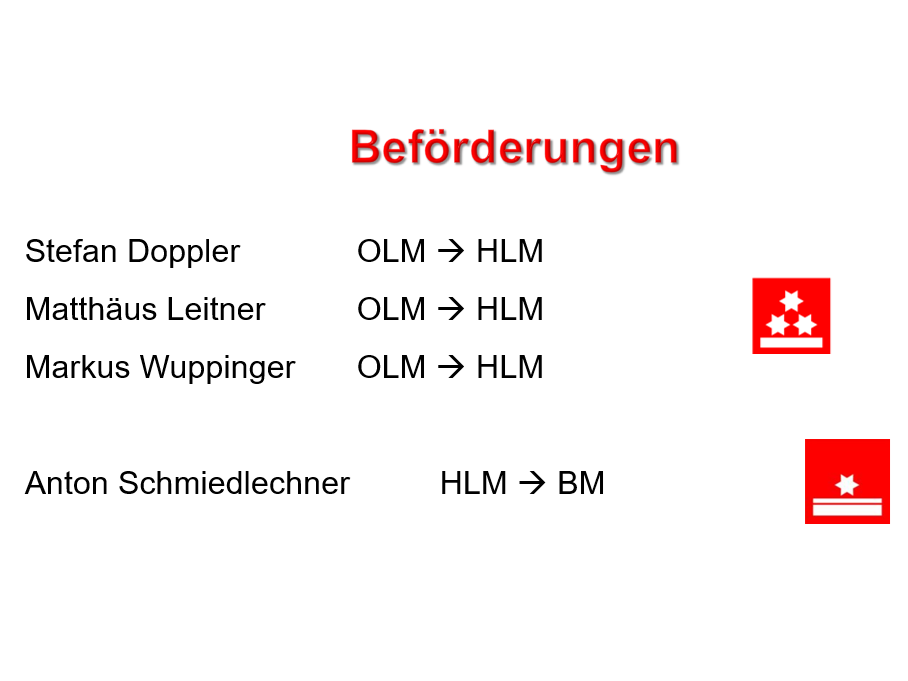 Die Kassenprüfer HLM Markus Wuppinger und HFM Stefan Stögbuchner berichten von der erfolgreichen Kassenprüfung. Der Antrag auf Entlastung des Kassenführers wird einstimmig angenommen.